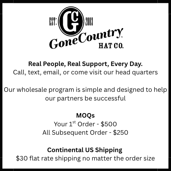Gone Country Hat Co. began as country music festival vendors and we have spent twenty years listening to consumers and building our product line around what customers want and need.